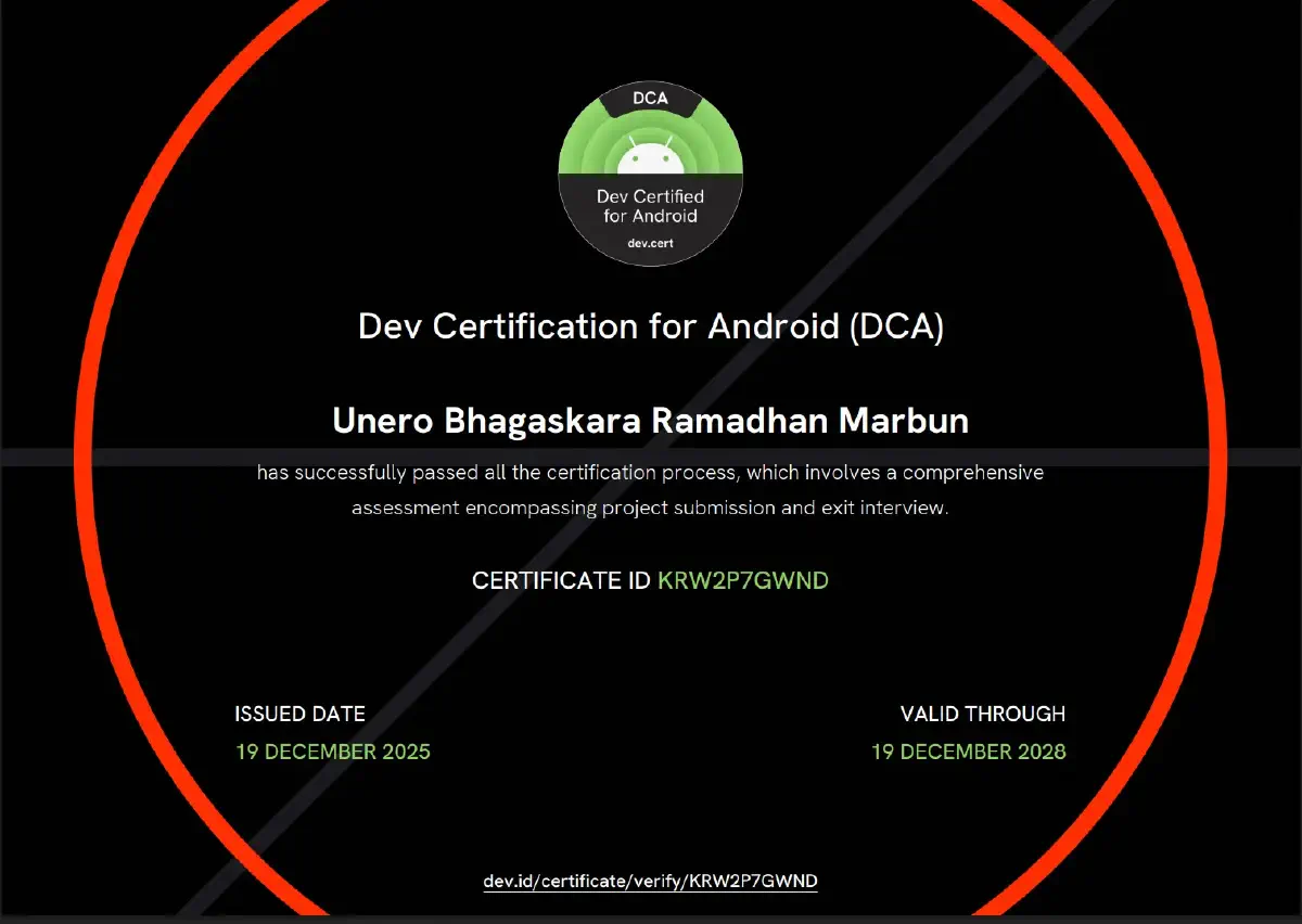 Menutup tahun 2025 lalu, saya mencoba sertifikasi Dev Certification for Android (DCA) melalui platform dev.cert dengan Dicoding sebagai Certification Partner. Platform ini menjadi alternatif bagi developer untuk memvalidasi skill teknis, terutama saat platform sertifikasi AAD milik Google sedang diperbarui.