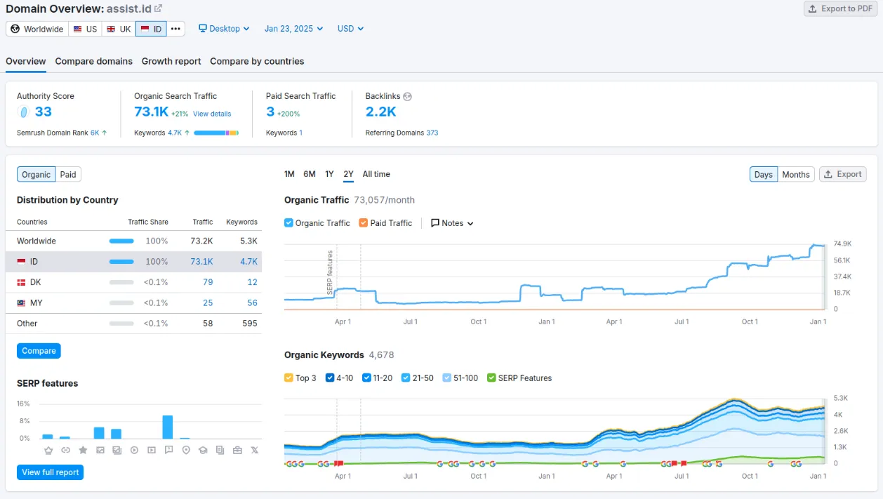 Dengan 6K keyword / bulan, membantu pertumbuhan traffic website. Pada data tahun 2024, traffic website mencapai 6K hingga 10K. -
